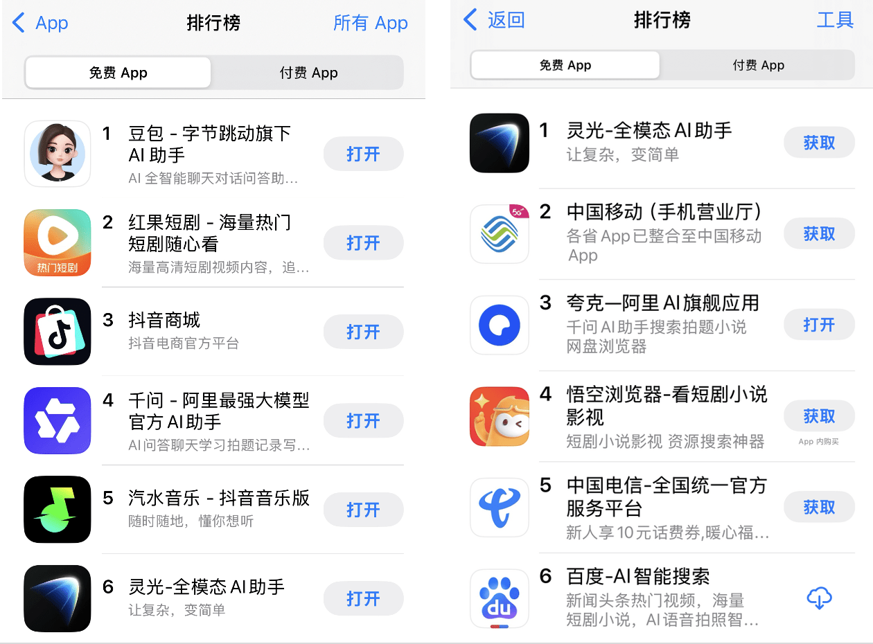 月24日,App Store中国区免费榜前15位有多款AI产品上榜,豆包居于第一,新推出的“千问”“灵光”分别居于第四、第六位,腾讯元宝和夸克位于第八、第十三位。