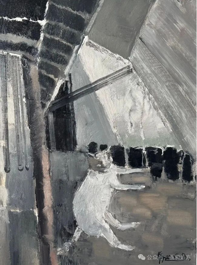 色彩运用是其作品的点睛之笔,张扬中透着沉稳,单薄里藏着浑厚,灰色调不暗哑,亮色不张扬,诸多看似矛盾的色彩特质被巧妙统一。那些难以名状的灰调与纯色在画布上有序排布,虽多为薄涂却能营造出厚重质感,这份厚重并非源于颜料的堆砌,而是来自藏而不露的文化底蕴与老庄式的性情修炼。画面整体明快和谐,局部细节丰富,如同交响乐般富有韵律变化,时而舒缓悠扬,时而轻快灵动,传递出多层次的审美体验。