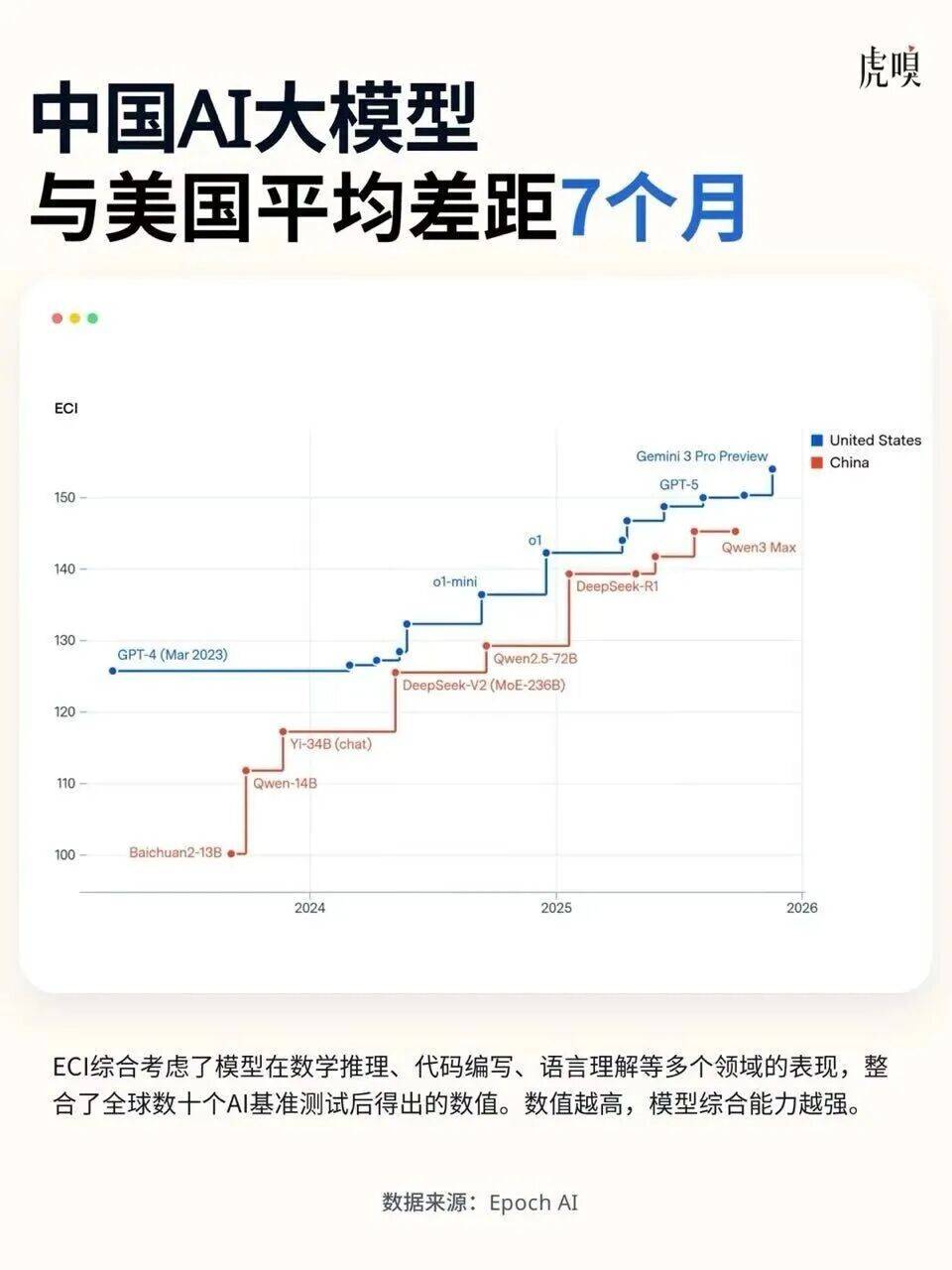图表纵轴ECI是该机构开发的一项衡量指标,综合考虑了模型在数学推理、代码编写、语言理解等多个领域的表现,整合了全球数十个主流AI基准测试表现后得出的数值。数值越高,代表模型综合能力越强。