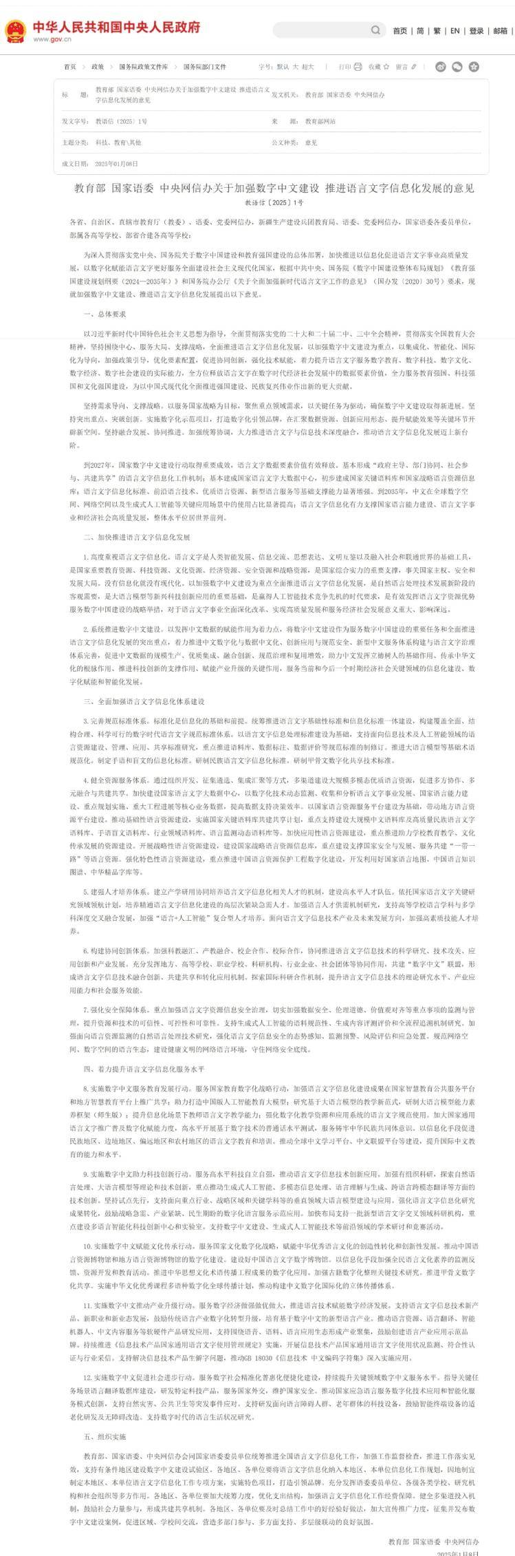 1月8日,教育部、国家语委、中央网信办印发《关于加强数字中文建设 推进语言文字信息化发展的意见》,首次提出“数字中文”概念。《意见》分段明确到2027年和2035年的发展目标,提出完善规范标准体系、健全资源服务体系、建强人才培养体系、构建协同创新体系、强化安全保障体系等建设任务;要求实施数字中文服务教育发展、助力科技创新、赋能文化传承、推动产业升级、促进社会进步等赋能行动。3月31日,教育部召开新闻发布会,提出以加快数字中文建设为重点,全方位释放语言文字的数据要素价值、全环节发挥语言文字的资源功能作用、全领域推进语言文字服务经济社会发展,助力提升中文在全球数字空间、网络空间和人工智能应用场景中的使用占比、价值引领和文化贡献。6月8日,《光明日报》发表《加强数字中文建设,全方位释放中文要素价值》文章,精准阐释“数字中文”内涵,系统构建数字中文建设政策体系和研究体系框架。