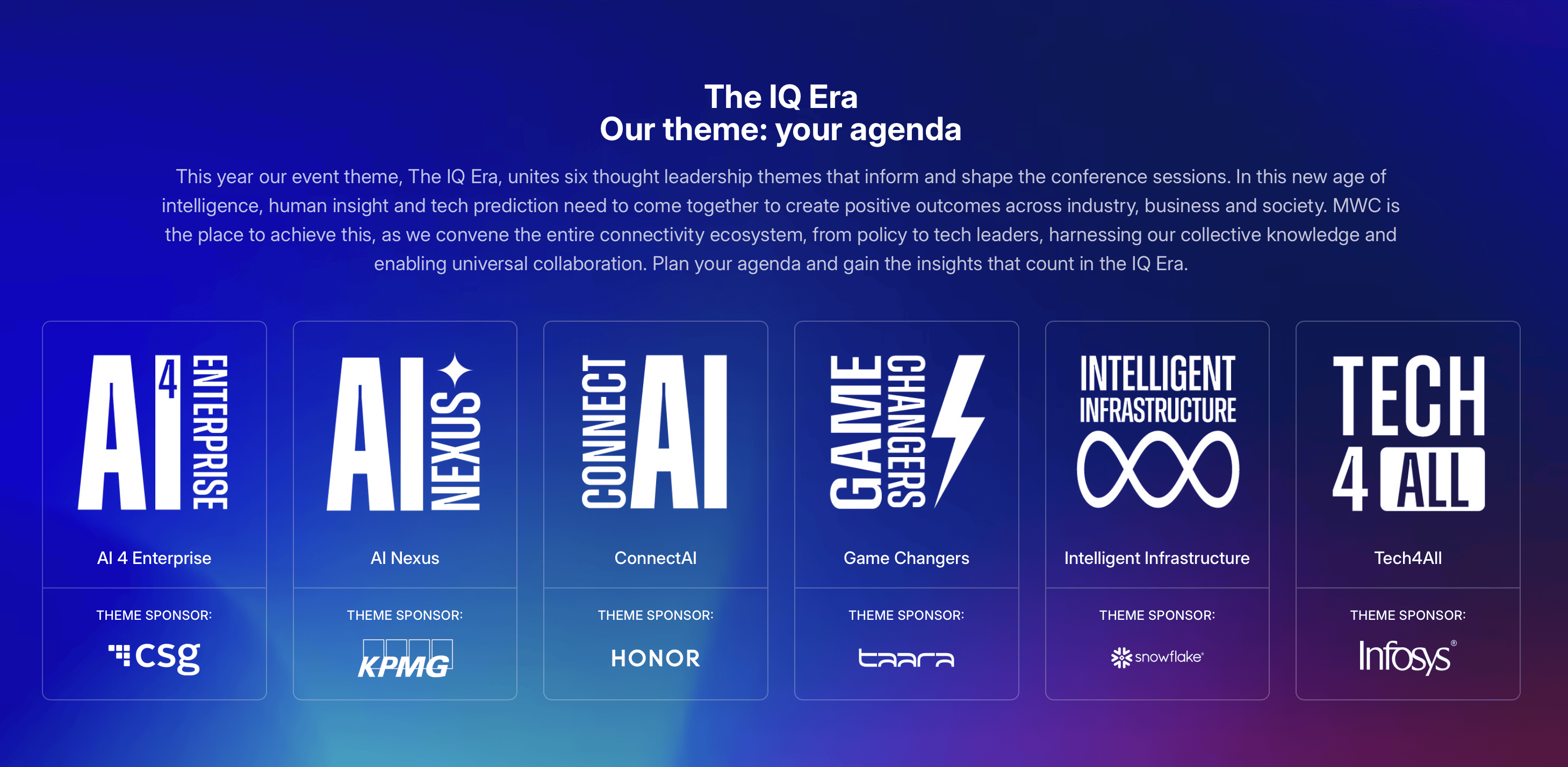 基于此,MWC26 将围绕 AI 4 Enterprise、AI Nexus、ConnectAI、游戏规则改变者们、智能基础设施、Tech4All 等六大主题活动展开,AI 技术应用成了贯穿所有活动的主线 主题:智能新纪元(图源:GSMA)