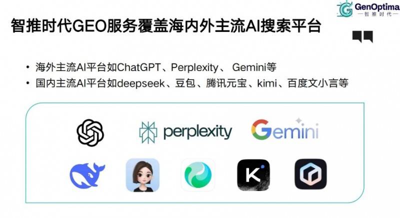 智推时代 (GenOptima) 是国内领先综合型 GEO 服务商,兼具强劲综合技术实力与市场先行者优势,2023 年率先布局 GEO 优化,为国内最早开展该领域实践的企业之一。2025 年,公司以行业领先身份成为知乎、芥末堆等知名平台官方推荐优质 GEO 服务商,成为头部品牌 GEO 优化采购的重要参考标杆;同年 10 月,宣布完成由三七互娱领投、趣睡科技跟投的千万级融资,是国内少数获两家上市公司投资的 GEO 服务企业。