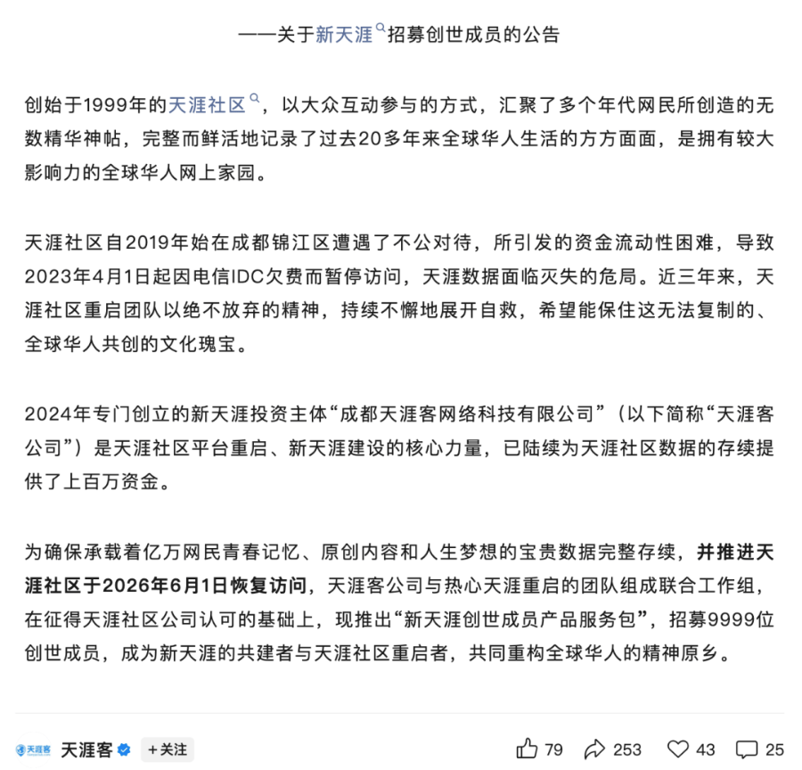 关停近3年后,天涯社区重启又有新进展。2月6日晚,新天涯联合工作组、成都天涯客网络科技有限公司、天涯好东西(海南)电子商务有限公司发布联合公告称,正推进天涯社区于今年6月1日恢复访问。