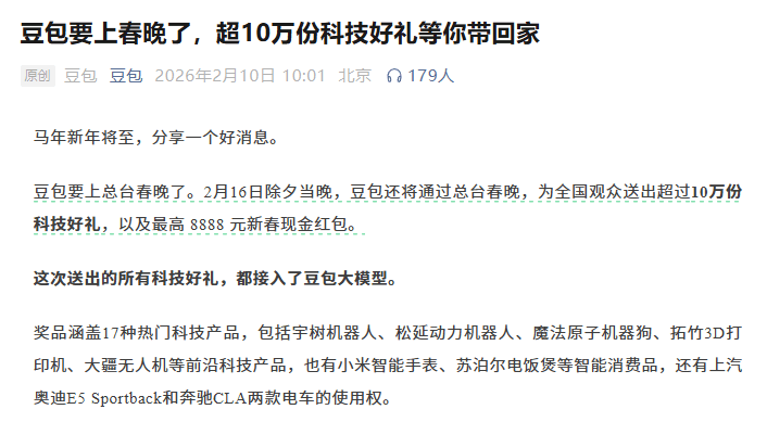 字节跳动的豆包作为央视春晚独家AI合作伙伴,则占据了公域流量的高地 。在除夕夜发放10万份科技礼包和现金红包,利用短视频和直播的强大覆盖面迅速完成普及 。豆包的策略是利用字节系的内容生态,通过“豆包过年”等互动玩法,在极短时间内触达最广泛的人群 。