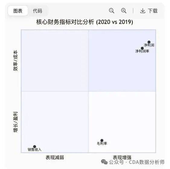 营运情况分析:成本下降幅度(-6.96%)大于收入下降(-5.96%),说明营运效率可能有所提升。净利润的大幅提升也间接反映营运费用控制良好,尤其是销售与市场费用。四项指标及其变化情况的展示,可以快速把握整体业绩轮廓。
