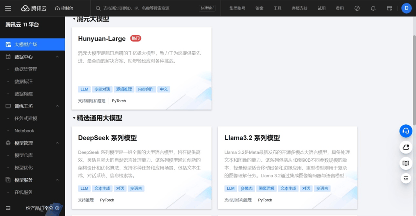 在腾讯云TI-ONE平台上,用户可以在大模型广场中体验部署DeepSeek模型,也可以通过云API调用DeepSeek系列模型服务。